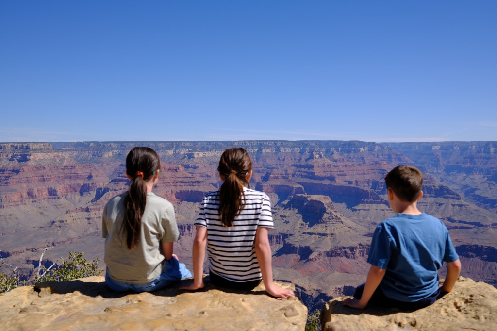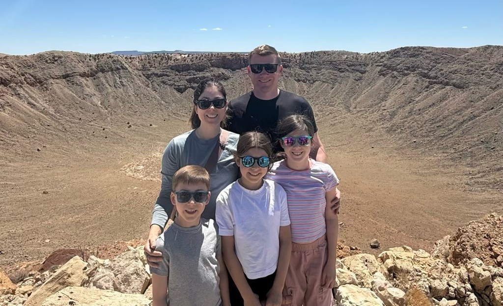 Justin was up early and got to see the desert sunrise and start a fire early to warm tent for others. After breakfast went to Grand Canyon for a hike. Kids were less impressed with Grand Canyon than the meteor crater site, but we made it through.